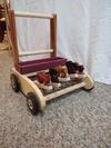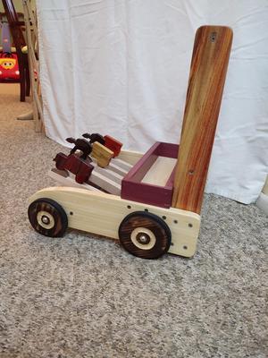 The wheels are burnt Bamboo with weather strip tread and the sides are Bamboo. Uprights are Deeply colored Canarywood. The front crossmember/tone bar is Walnut. It has a Purpleheart storage area.