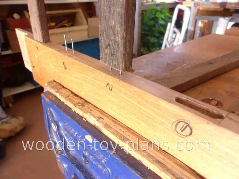 First, I marked out the position for two dowel pins in the end grain of the slats. Of course, the drill bit is going to wander off a fraction, so I am going to use the dowel nails to locate the position of the holes in the corresponding rail. Much like the dowel centres for wooden dowels.