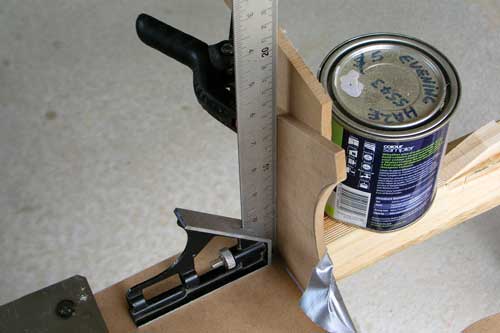 7. Fold up the end making sure the corner remains flush. Clamp the right angle jig in place and check for squareness. The photo shows the parts held in place with weights (in this case, the paint tin).