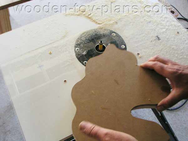 Using the free rocking horse plan, make a rough cut about 1.5mm (or 1/16") oversize, then temporarily attach the template to the workpiece using double sided sticky tape.