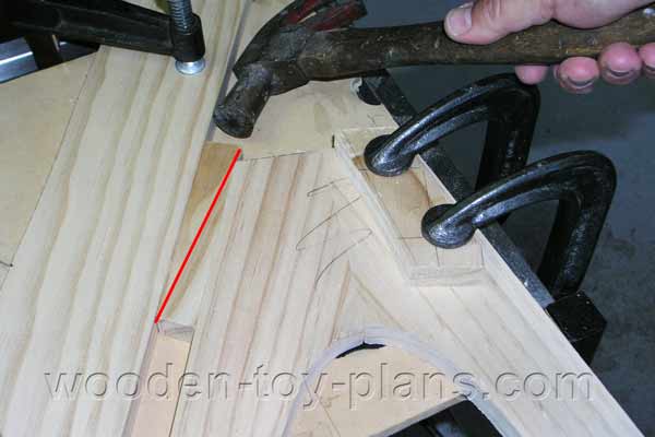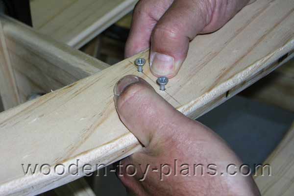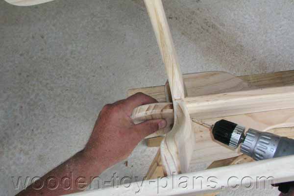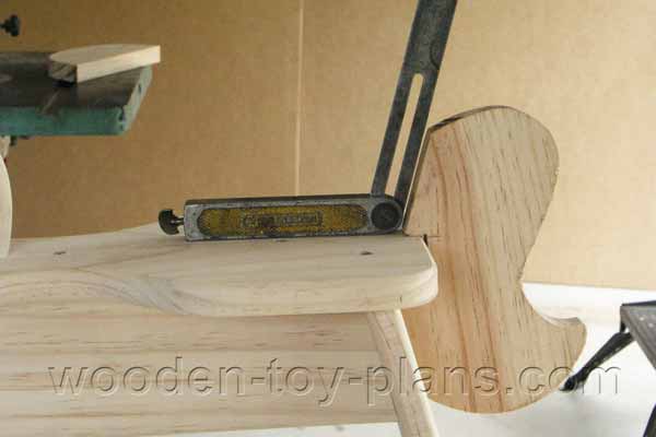 Detail showing method of attaching the rockers to the legs. In this photo I used the screws to mark the position for pilot holes for the screws, in order to minimise the chance of splitting the wood.