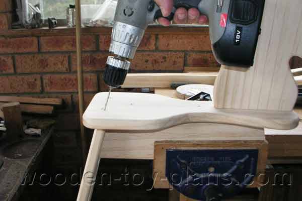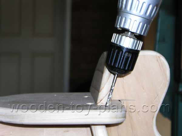 More pilot holes! This one on the edge of the seat, just past the top of the legs, to secure the backrest.