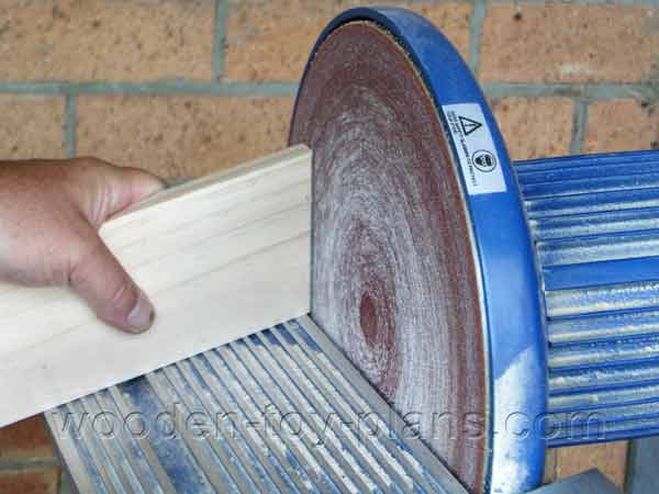 The top of the legs have to be bevelled to match the angle of the body. Here I am using the body to set the angle. Although a 12" disc sander is not absolutely essential for this project, I have found it to be a very useful machine.