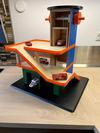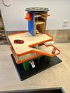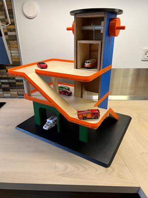 One design failure I saw with every store-bought parking garage was that the knob that lifts and lowers the elevator was always undersized, making it hard for little hands to operate, and placed only on one side of the dowel, so the child often had to move around the garage to operate the lift. Both of these things resulted in kids not using the elevator. To try and remedy that I added oversized knobs to both sides of the elevator dowel.